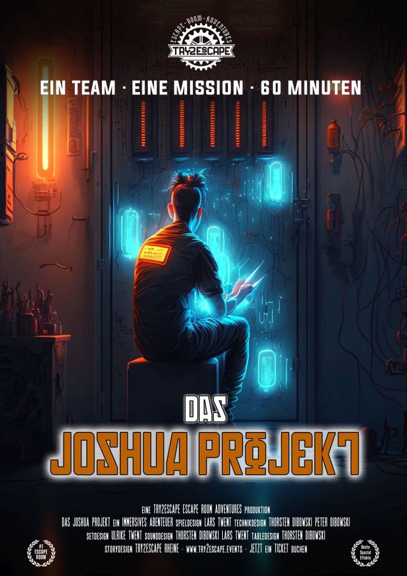 Die Story Unter dem Projektnamen „Joshua“ entwickelt die Firma ProtoVision eine Art „Superbatterie“. Die Experten sind der Meinung, dass dieser Energieträger die weltweiten Ressourcenprobleme lösen könnte. Euer Team bricht im Auftrag einer Geheimorganisation bei ProtoVision ein. Versucht innerhalb von 60 Minuten sämtliche Sicherheitssysteme zu umgehen und „Joshua“ zu stehlen. Unser Kontaktmann Bob hat euch als bestes Team für diesen Job vorgeschlagen.Seid ihr bereit diese Aufgabe zu übernehmen? Das solltest Du wissen Geeignet für Escape-Einsteiger und erfahrene Spieler Lineare Rätselführung Für 3-6 Spieler Für Kinder ab 9 Jahren geeignet (bei Begleitung durch Erwachsene) Dietriche und Stemmeisen bitte zu Hause lassen. Alle Werkzeuge bekommt ihr von uns. Unsere Spiele sind für Kinder geeignet, aber für Erwachsene konzipiert. Deshalb können Kinder bis 14 Jahren nur in Begleitung von Erwachsenen spielen.